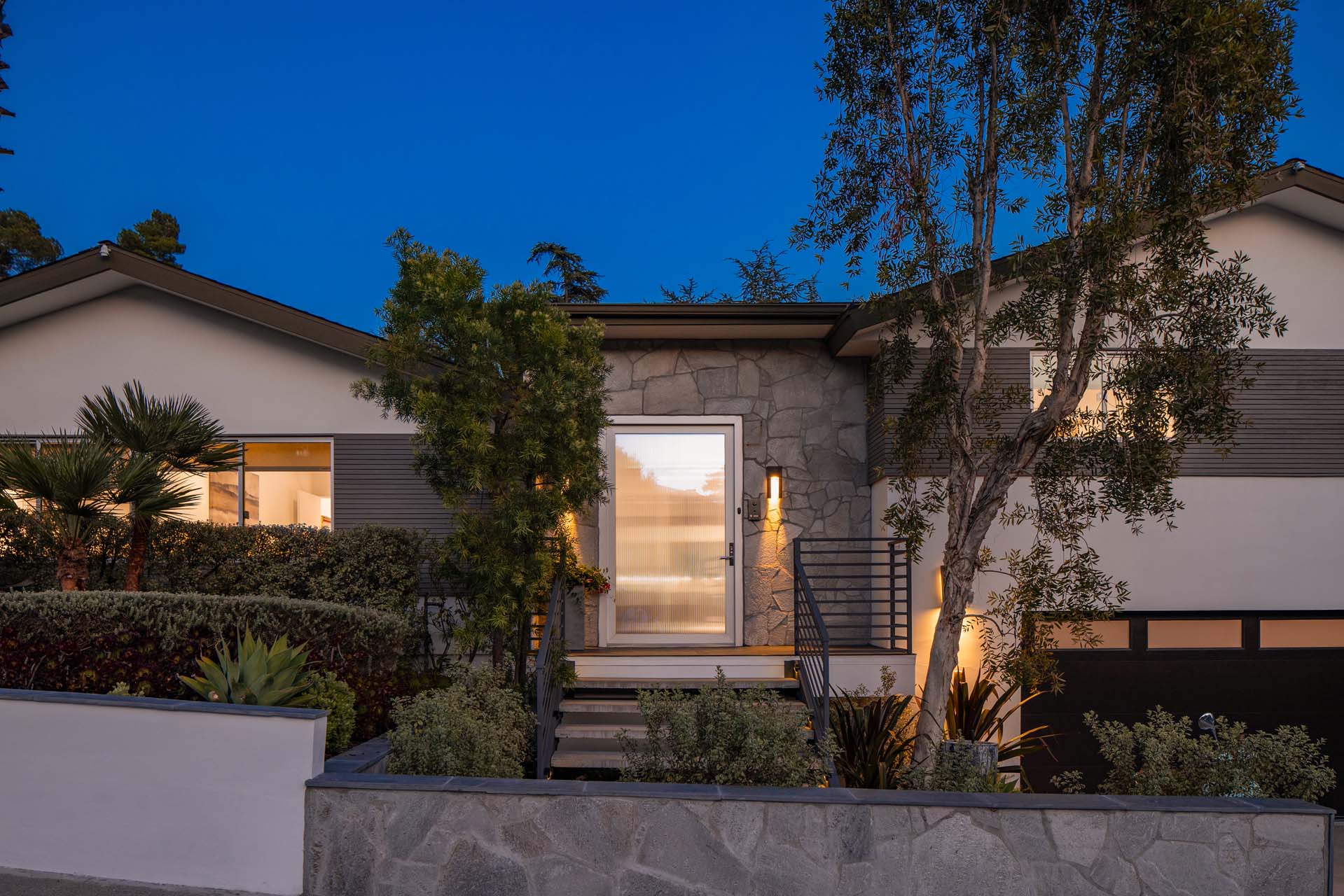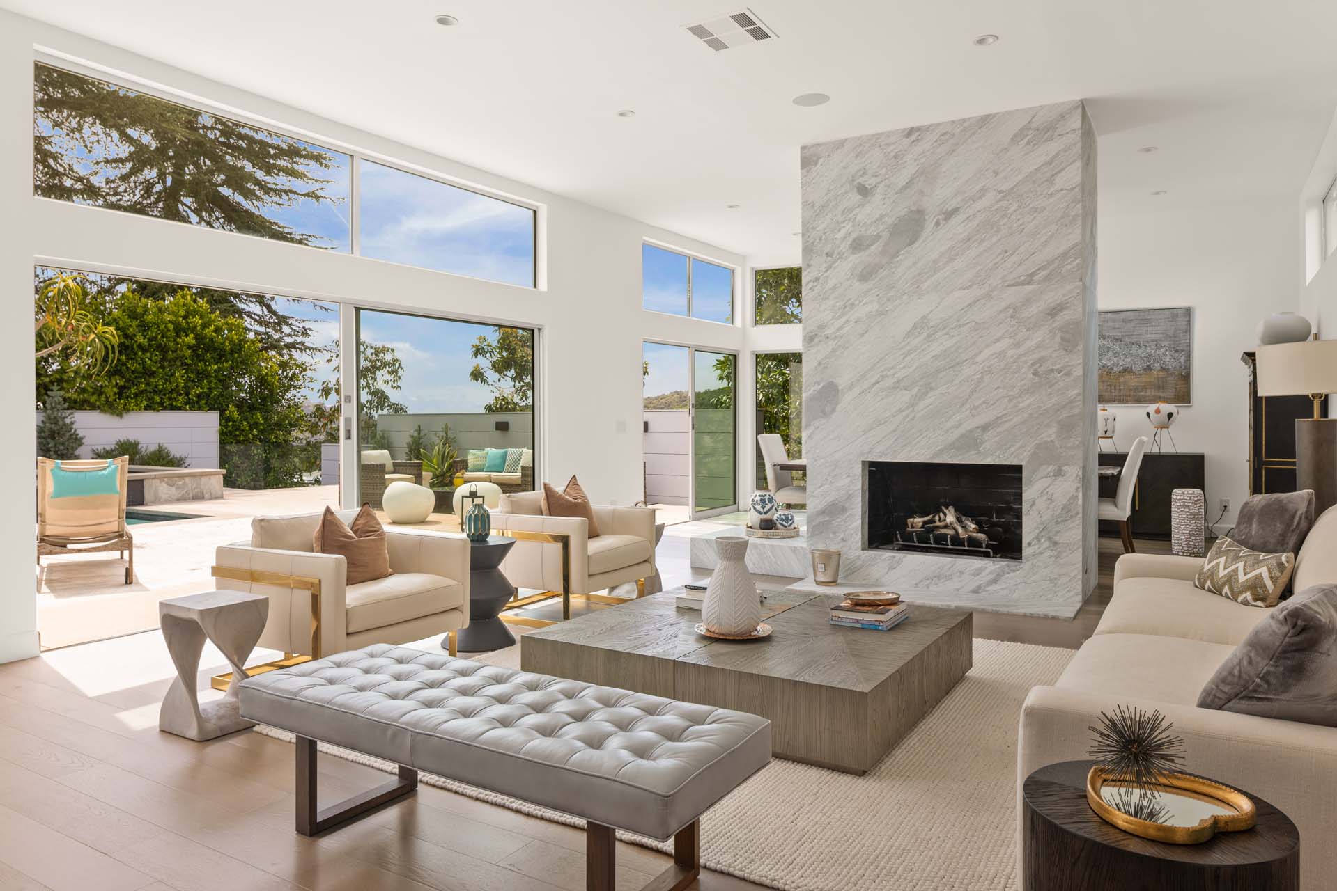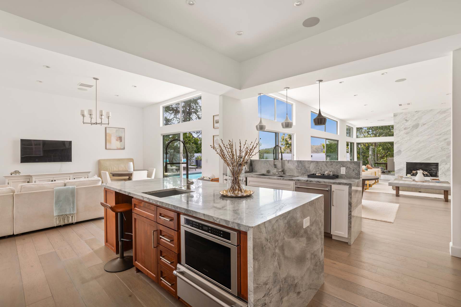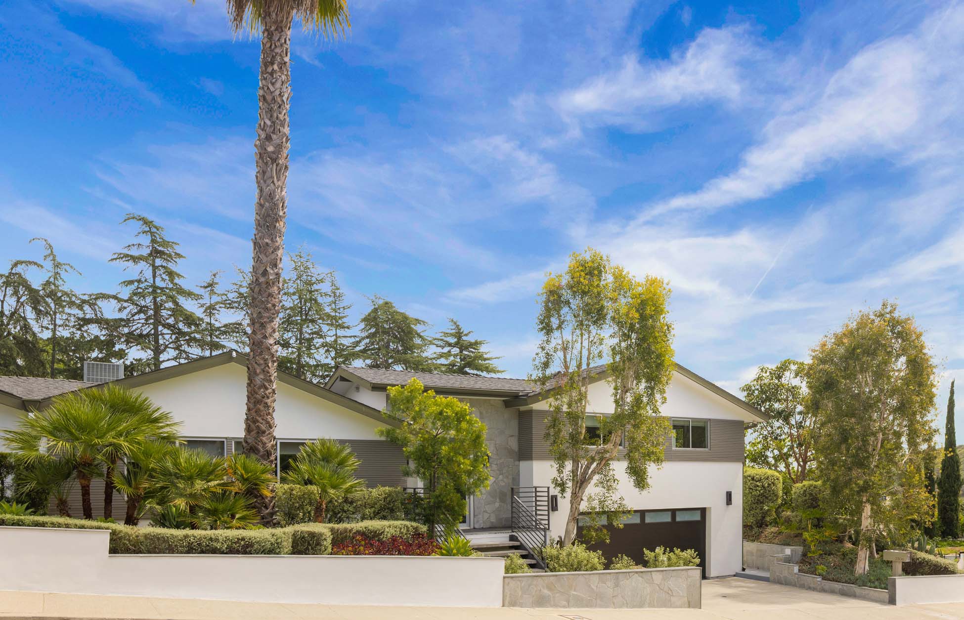 Spectacular, refined and sophisticated renovation of a classic, circa 1963 Brentwood Mid-Century Modern. Expansive light-filled floor plan almost entirely on one level, artfully designed with soaring nearly eleven foot ceilings. Stunning sun-drenched living room with floor-to-ceiling Fleetwood doors flows seamlessly into a newly expanded formal dining room framed by artful Grey Pietra Santa Select marble showpiece fireplace and grand windows leading to sun-dappled greenery and picturesque canyon vistas beyond. Spacious chef’s kitchen is both elegant and highly functional, appointed with premium Thermador appliances, richly veined marble countertops, and bespoke cabinetry—designed to complement the home’s clean architectural lines while elevating everyday living. Primary suite with refined Taj Mahal marble fireplace. Primary bath with luxurious Bianco Venatino Carrara marble and stylish Hansgrohe fixtures. Handsome wide plank European Oak flooring throughout. Additional spaces include a spacious media/library/game room with surround sound, a flexible fifth bedroom currently styled as a gym, and a separate office easily adaptable as a sixth bedroom—offering versatility for modern living. Outdoors, the property transforms into a secluded retreat. A sparkling pool and spa are surrounded by lush, mature landscaping and an expansive bluestone patio designed for effortless entertaining and dining al fresco. Romantic sunken firepit for cocktails at sunset. Blue ocean views down the canyon on clear days. Ideally positioned near some of the Westside’s most coveted hiking and mountain biking trails, the home offers a rare connection to nature without sacrificing proximity to the best of the city. Private, serene, and impeccably executed, this Brentwood offering is reminiscent of a perfectly curated Palm Springs retreat–blending architectural integrity with glamorous indoor/outdoor living, comfort, and unparalleled amenities.