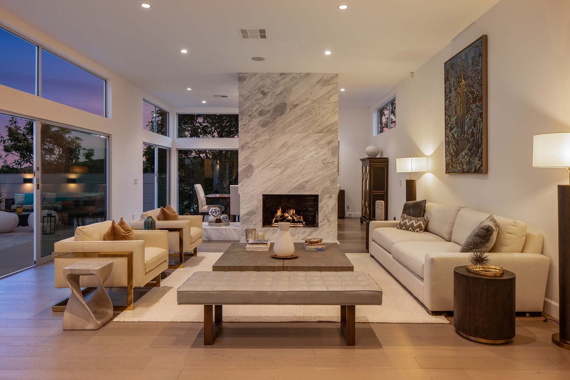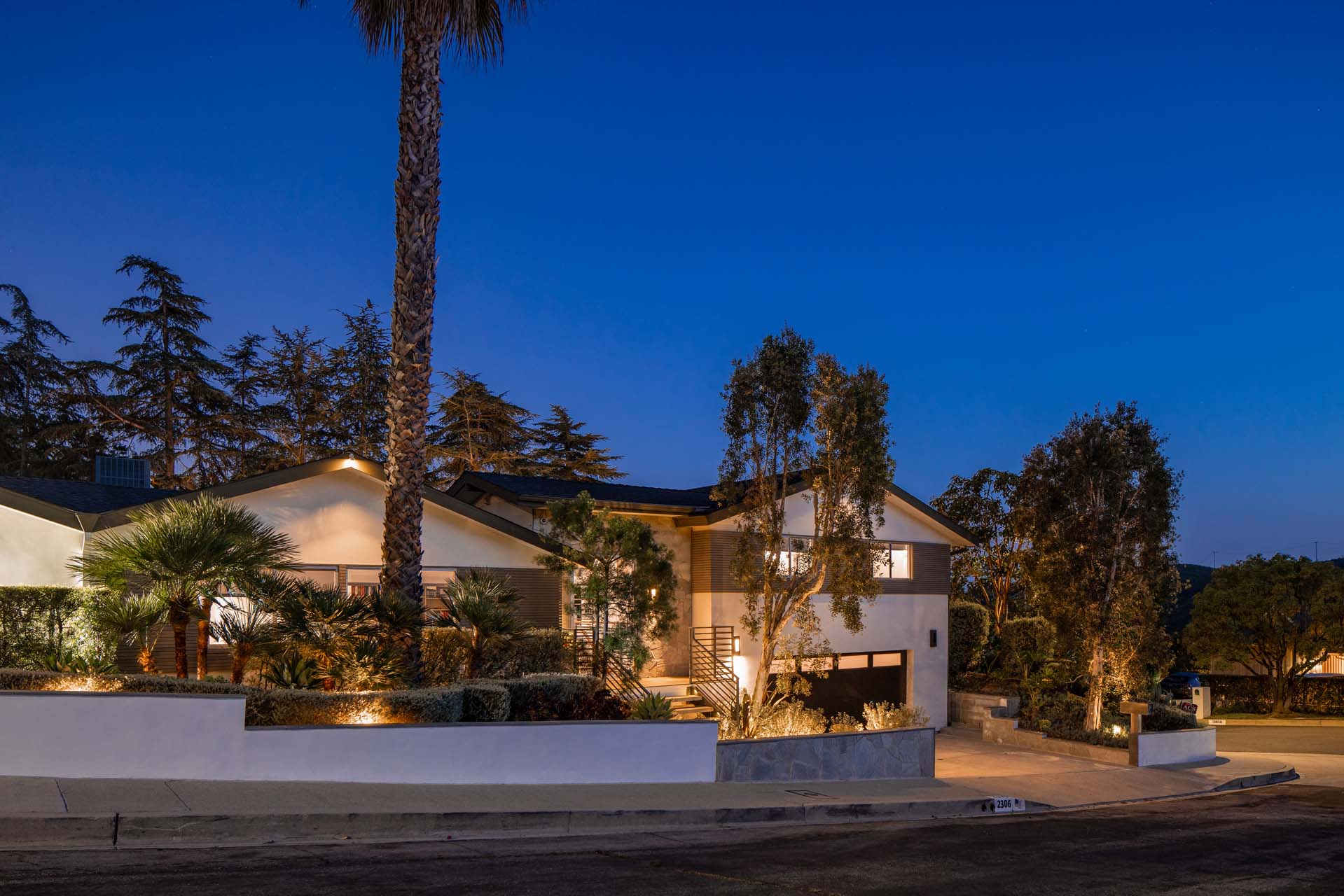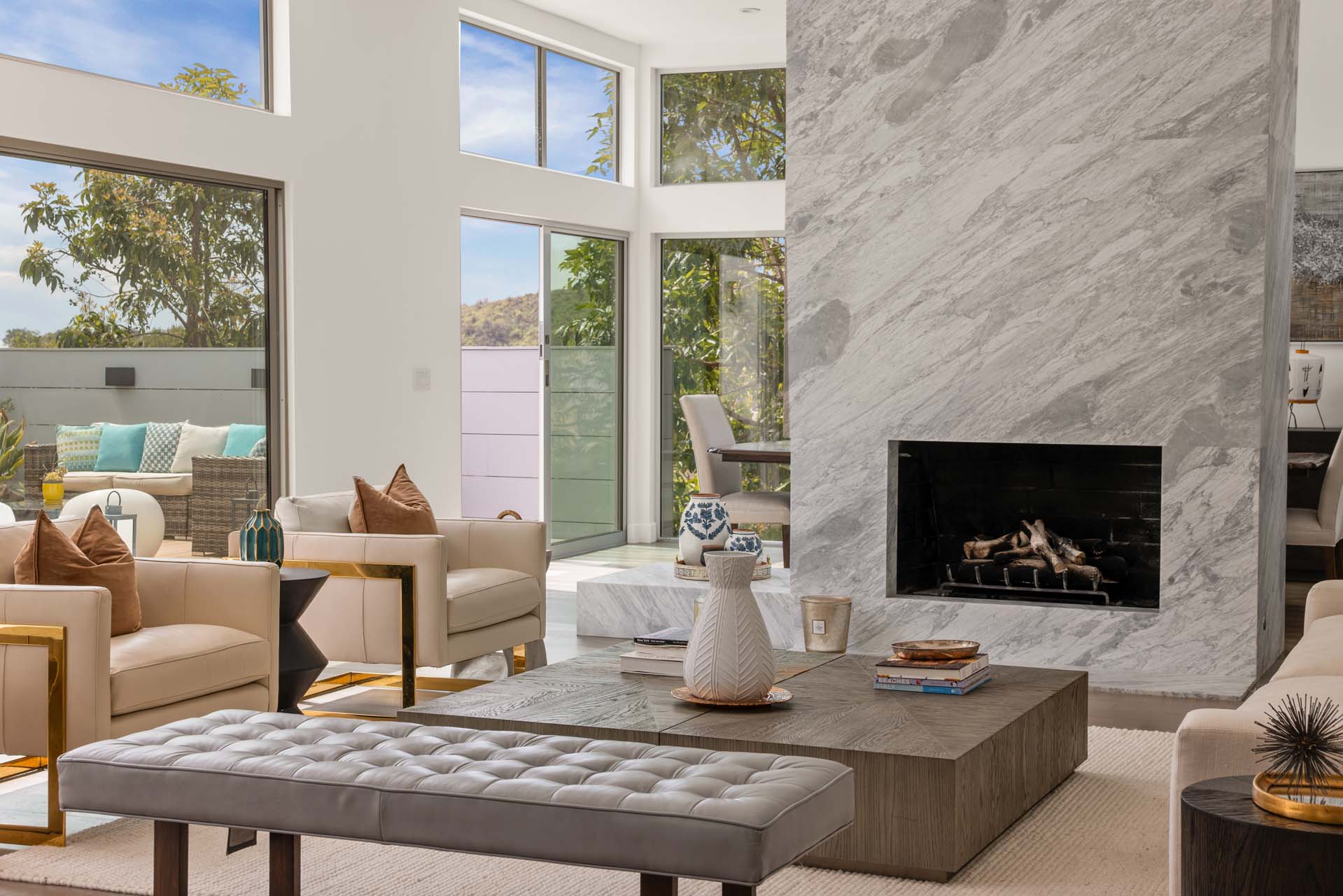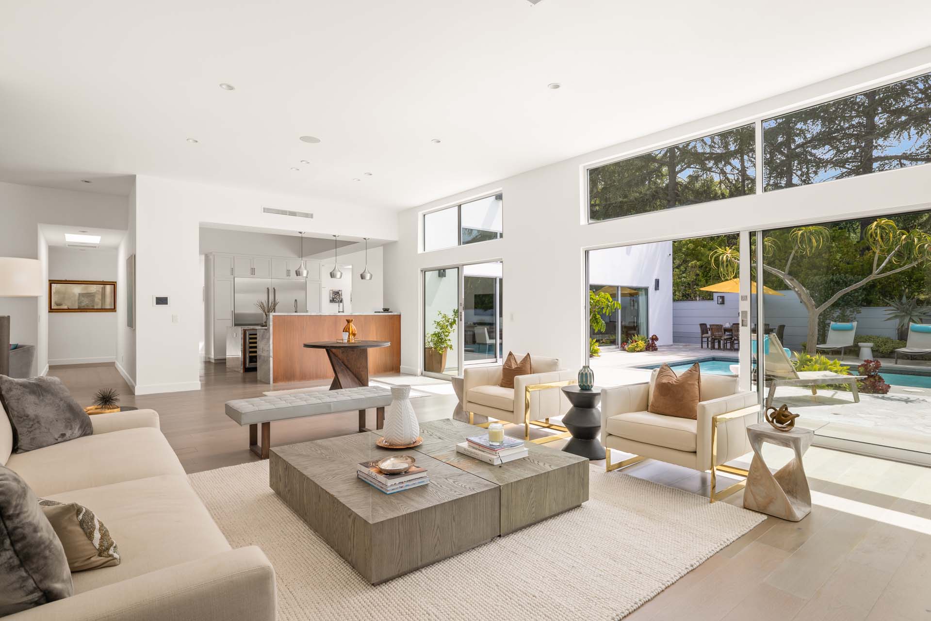Spectacular, refined and sophisticated renovation of a classic, circa 1963 Brentwood Mid-Century Modern. Expansive light-filled floor plan almost entirely on one level, artfully designed with soaring nearly eleven foot ceilings. Stunning sun-drenched living room with floor-to-ceiling Fleetwood doors flows seamlessly into a newly expanded formal dining room framed by artful Grey Pietra Santa Select marble showpiece fireplace and grand windows leading to sun-dappled greenery and picturesque canyon vistas beyond. Spacious chef’s kitchen is both elegant and highly functional, appointed with premium Thermador appliances, richly veined marble countertops, and bespoke cabinetry—designed to complement the home’s clean architectural lines while elevating everyday living. Primary suite with refined Taj Mahal marble fireplace. Primary bath with luxurious Bianco Venatino Carrara marble and stylish Hansgrohe fixtures. Handsome wide plank European Oak flooring throughout. Additional spaces include a spacious media/library/game room with surround sound, a flexible fifth bedroom currently styled as a gym, and a separate office easily adaptable as a sixth bedroom—offering versatility for modern living. Outdoors, the property transforms into a secluded retreat. A sparkling pool and spa are surrounded by lush, mature landscaping and an expansive bluestone patio designed for effortless entertaining and dining al fresco. Romantic sunken firepit for cocktails at sunset. Blue ocean views down the canyon on clear days. Ideally positioned near some of the Westside’s most coveted hiking and mountain biking trails, the home offers a rare connection to nature without sacrificing proximity to the best of the city. Private, serene, and impeccably executed, this Brentwood offering is reminiscent of a perfectly curated Palm Springs retreat–blending architectural integrity with glamorous indoor/outdoor living, comfort, and unparalleled amenities.