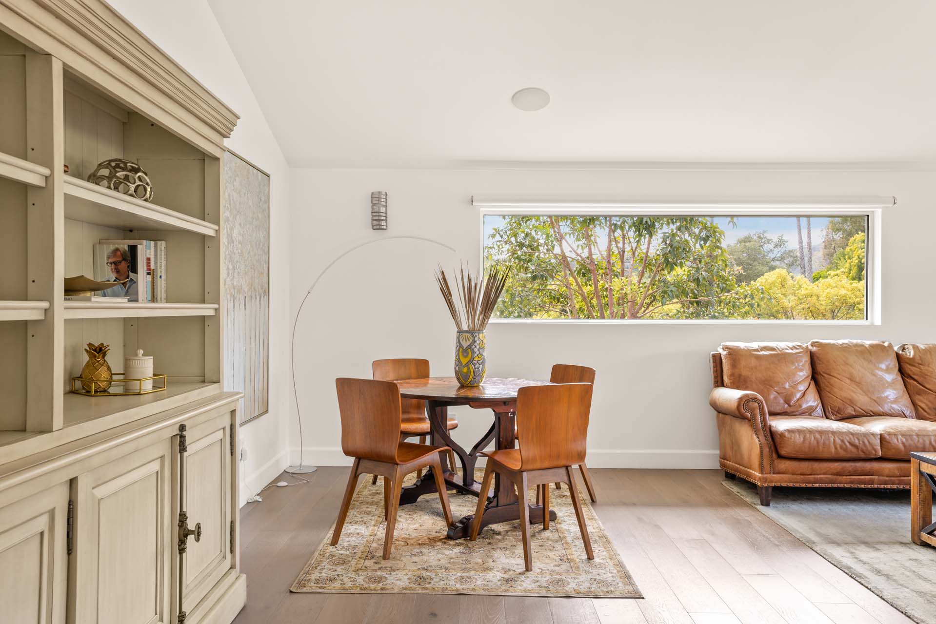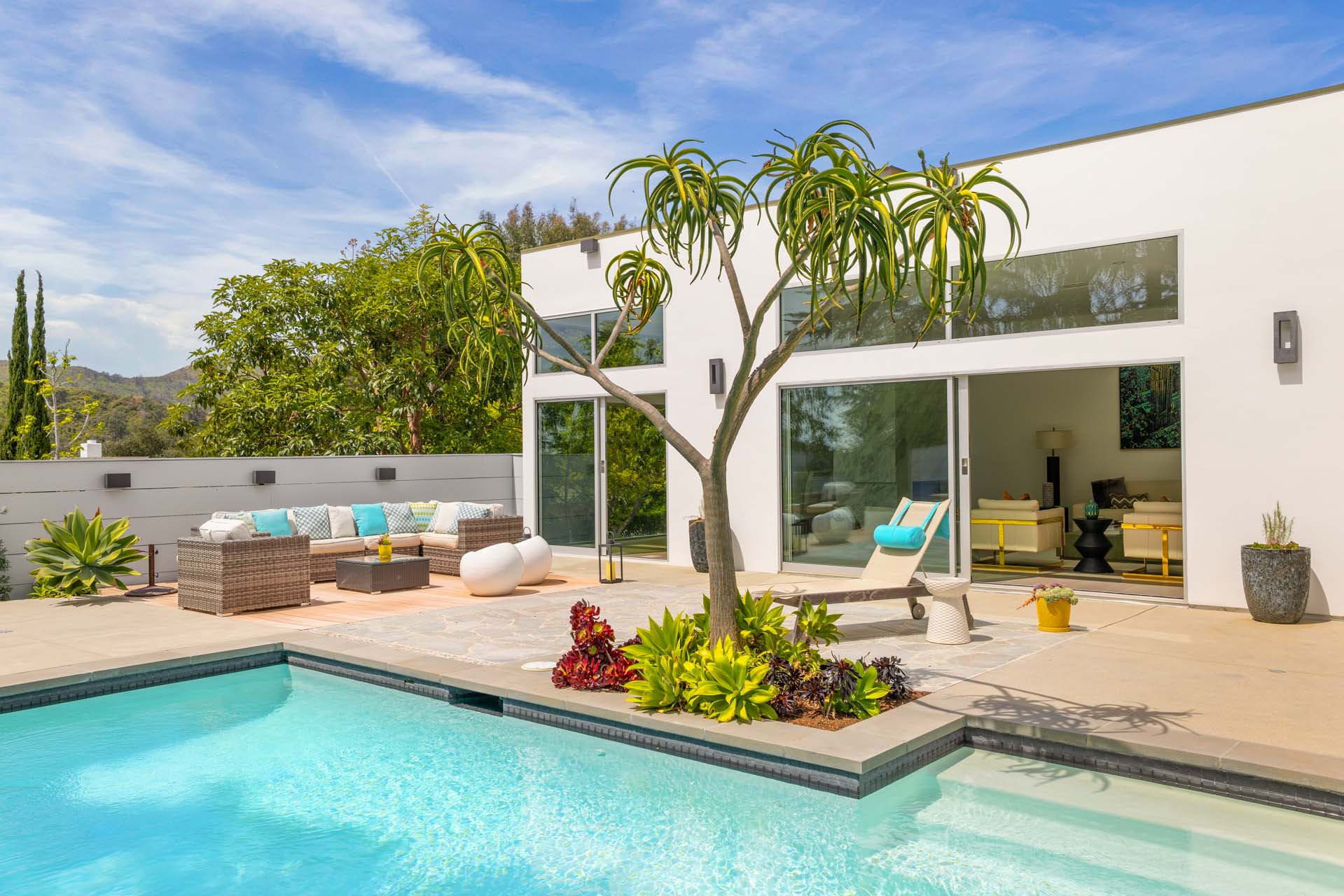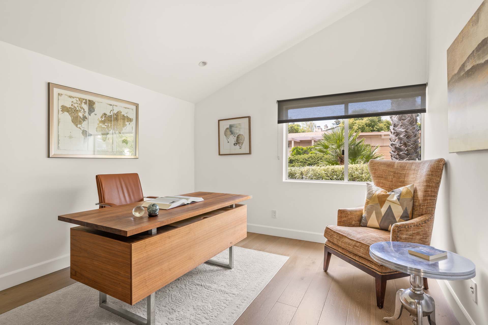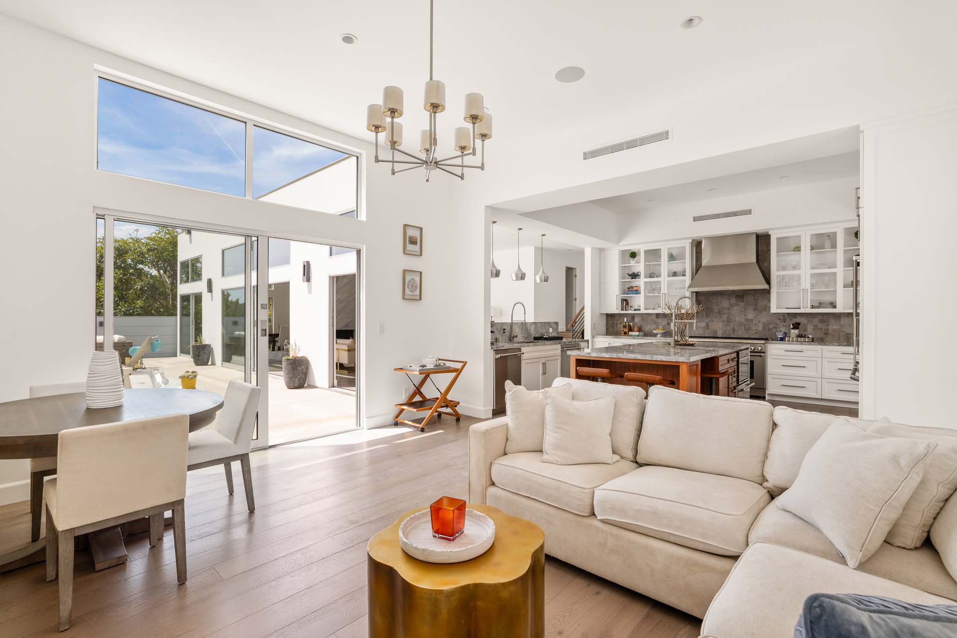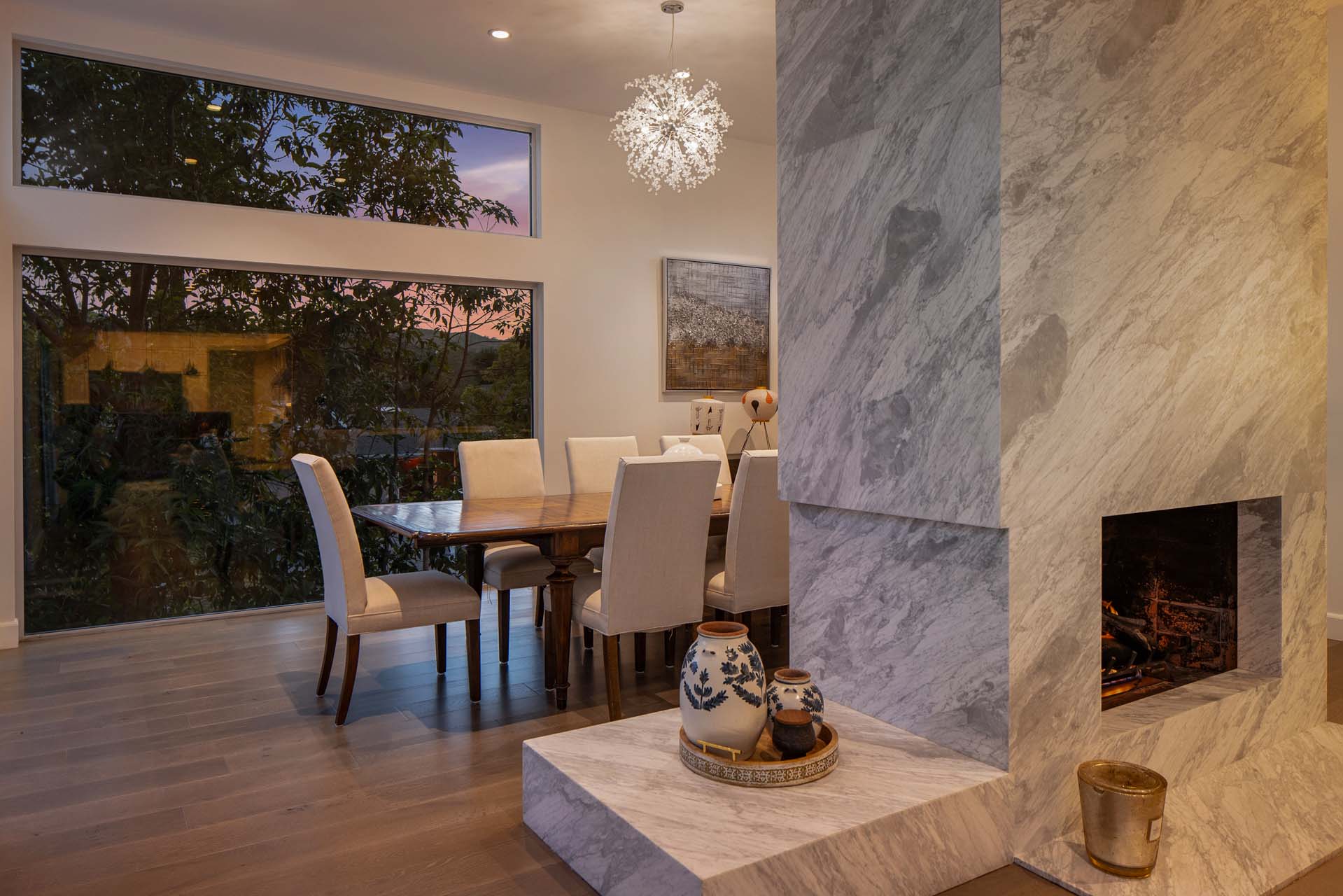 Spectacular, refined and sophisticated renovation of a classic, circa 1963 Brentwood Mid-Century Modern. Expansive light-filled floor plan almost entirely on one level, artfully designed with soaring nearly eleven foot ceilings. Stunning sun-drenched living room with floor-to-ceiling Fleetwood doors flows seamlessly into a newly expanded formal dining room framed by artful Grey Pietra Santa Select marble showpiece fireplace and grand windows leading to sun-dappled greenery and picturesque canyon vistas beyond. Spacious chef’s kitchen is both elegant and highly functional, appointed with premium Thermador appliances, richly veined marble countertops, and bespoke cabinetry—designed to complement the home’s clean architectural lines while elevating everyday living. Primary suite with refined Taj Mahal marble fireplace. Primary bath with luxurious Bianco Venatino Carrara marble and stylish Hansgrohe fixtures. Handsome wide plank European Oak flooring throughout. Additional spaces include a spacious media/library/game room with surround sound, a flexible fifth bedroom currently styled as a gym, and a separate office easily adaptable as a sixth bedroom—offering versatility for modern living. Outdoors, the property transforms into a secluded retreat. A sparkling pool and spa are surrounded by lush, mature landscaping and an expansive bluestone patio designed for effortless entertaining and dining al fresco. Romantic sunken firepit for cocktails at sunset. Blue ocean views down the canyon on clear days. Ideally positioned near some of the Westside’s most coveted hiking and mountain biking trails, the home offers a rare connection to nature without sacrificing proximity to the best of the city. Private, serene, and impeccably executed, this Brentwood offering is reminiscent of a perfectly curated Palm Springs retreat–blending architectural integrity with glamorous indoor/outdoor living, comfort, and unparalleled amenities.