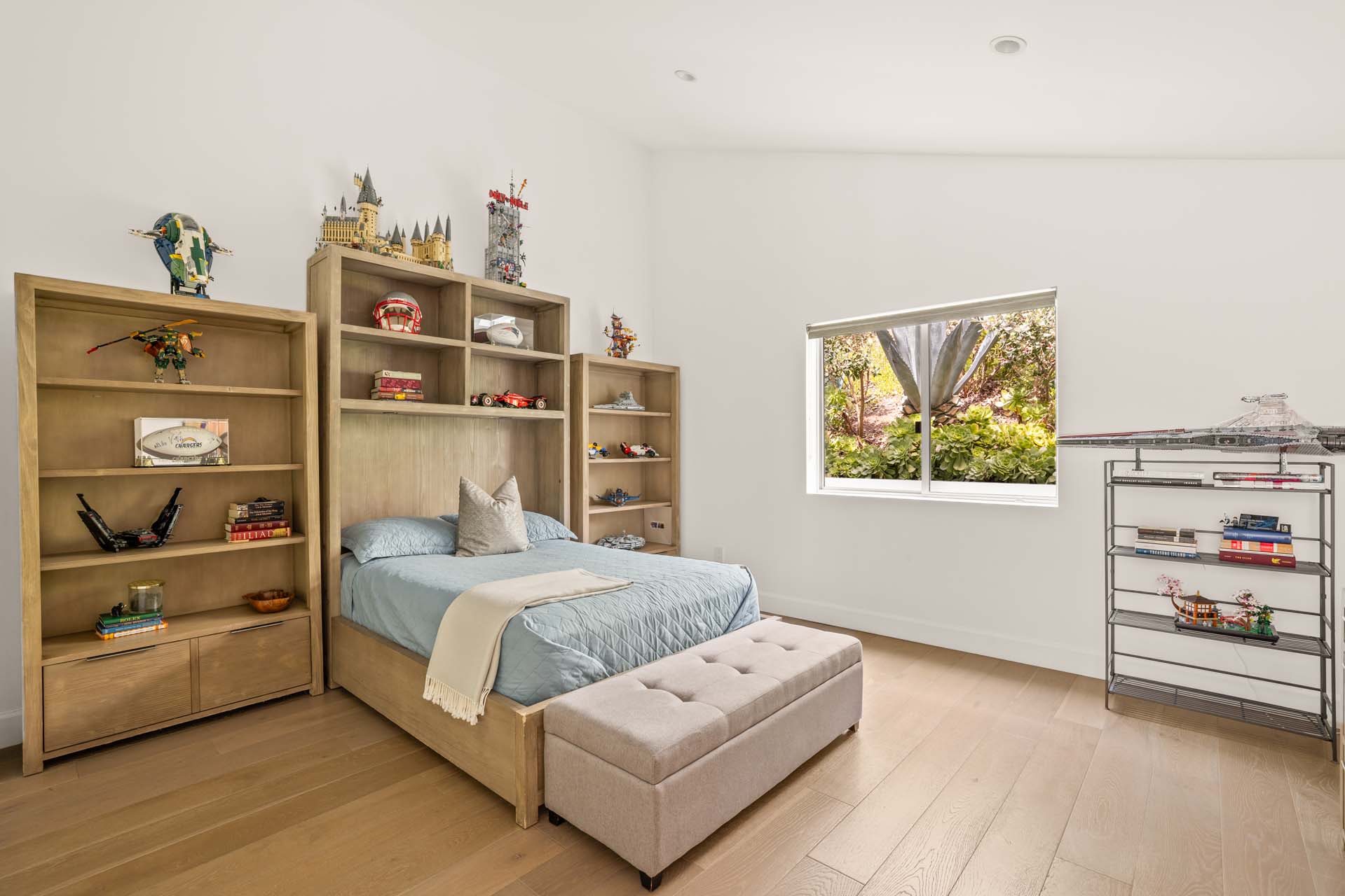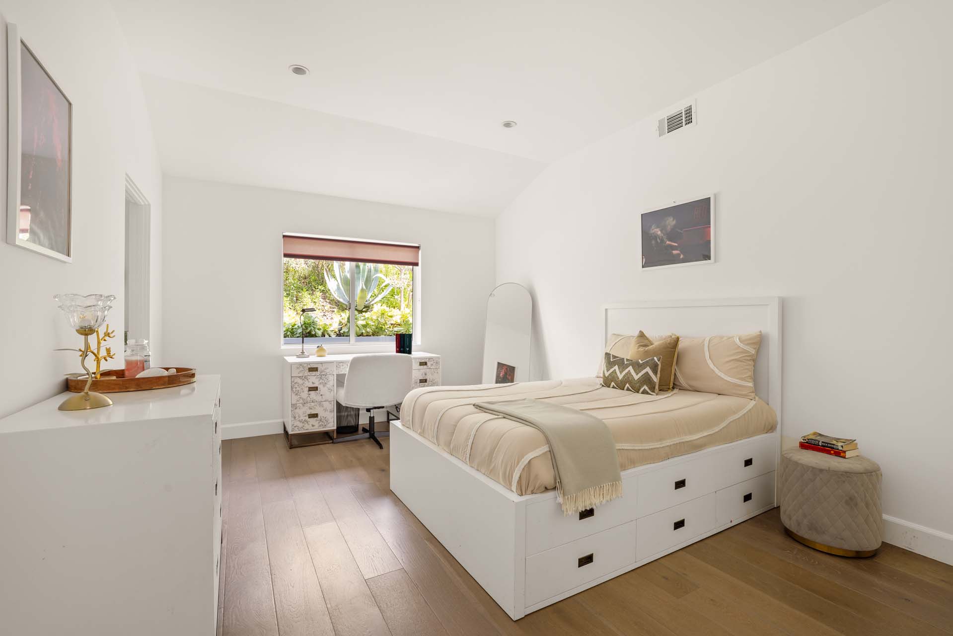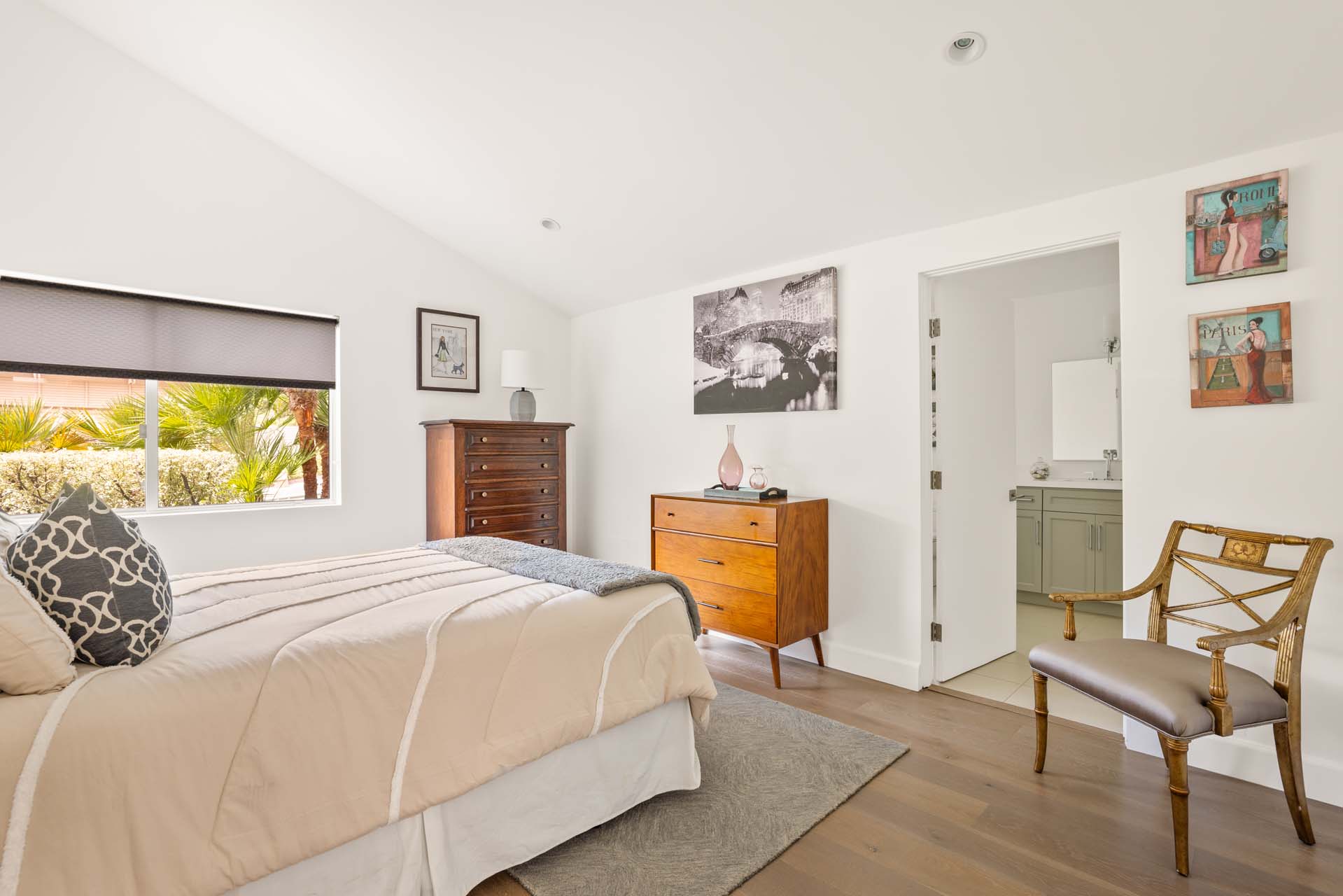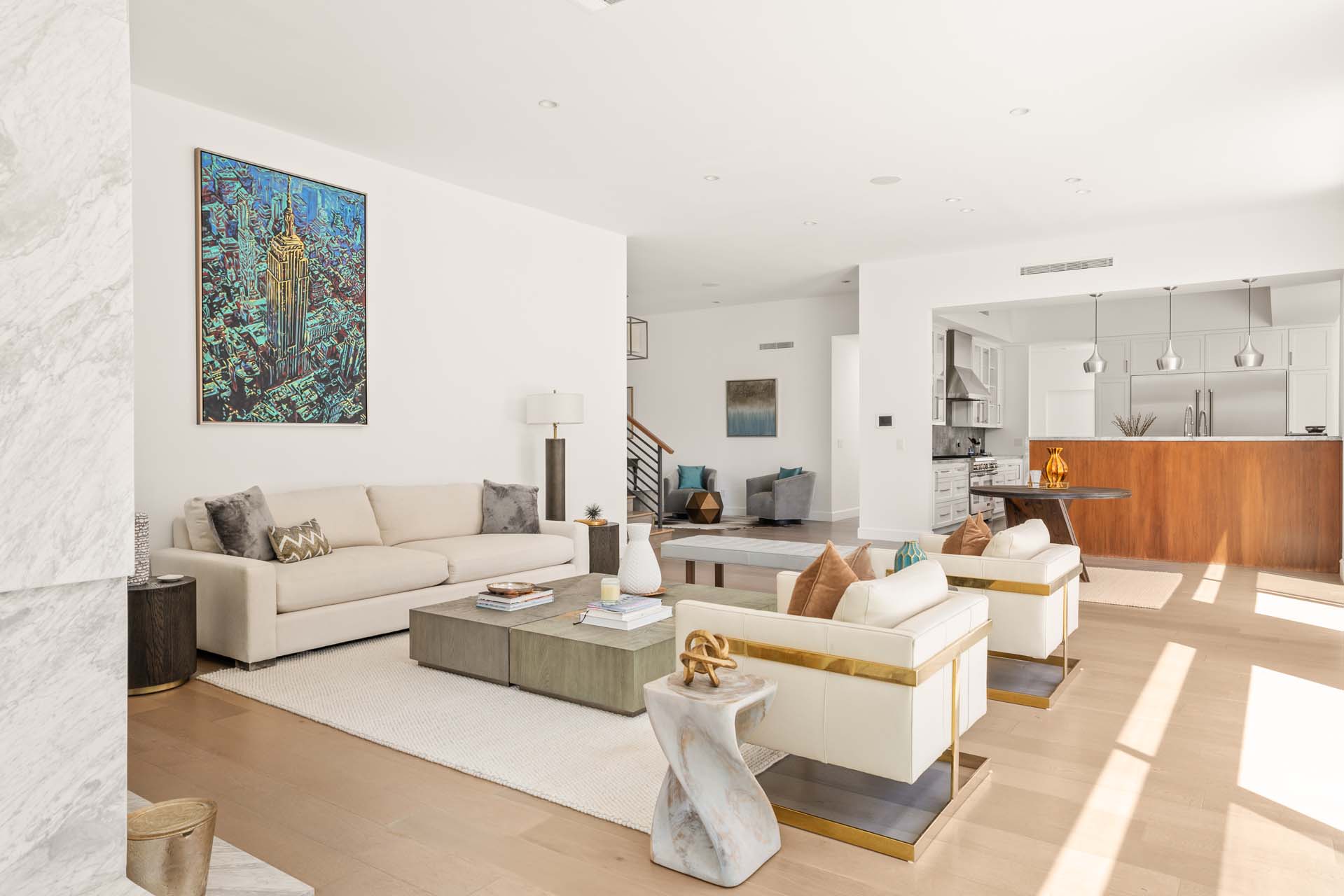 Spectacular, refined and sophisticated renovation of a classic, circa 1963 Brentwood Mid-Century Modern. Expansive light-filled floor plan almost entirely on one level, artfully designed with soaring nearly eleven foot ceilings. Stunning sun-drenched living room with floor-to-ceiling Fleetwood doors flows seamlessly into a newly expanded formal dining room framed by artful Grey Pietra Santa Select marble showpiece fireplace and grand windows leading to sun-dappled greenery and picturesque canyon vistas beyond. Spacious chef’s kitchen is both elegant and highly functional, appointed with premium Thermador appliances, richly veined marble countertops, and bespoke cabinetry—designed to complement the home’s clean architectural lines while elevating everyday living. Primary suite with refined Taj Mahal marble fireplace. Primary bath with luxurious Bianco Venatino Carrara marble and stylish Hansgrohe fixtures. Handsome wide plank European Oak flooring throughout. Additional spaces include a spacious media/library/game room with surround sound, a flexible fifth bedroom currently styled as a gym, and a separate office easily adaptable as a sixth bedroom—offering versatility for modern living. Outdoors, the property transforms into a secluded retreat. A sparkling pool and spa are surrounded by lush, mature landscaping and an expansive bluestone patio designed for effortless entertaining and dining al fresco. Romantic sunken firepit for cocktails at sunset. Blue ocean views down the canyon on clear days. Ideally positioned near some of the Westside’s most coveted hiking and mountain biking trails, the home offers a rare connection to nature without sacrificing proximity to the best of the city. Private, serene, and impeccably executed, this Brentwood offering is reminiscent of a perfectly curated Palm Springs retreat–blending architectural integrity with glamorous indoor/outdoor living, comfort, and unparalleled amenities.